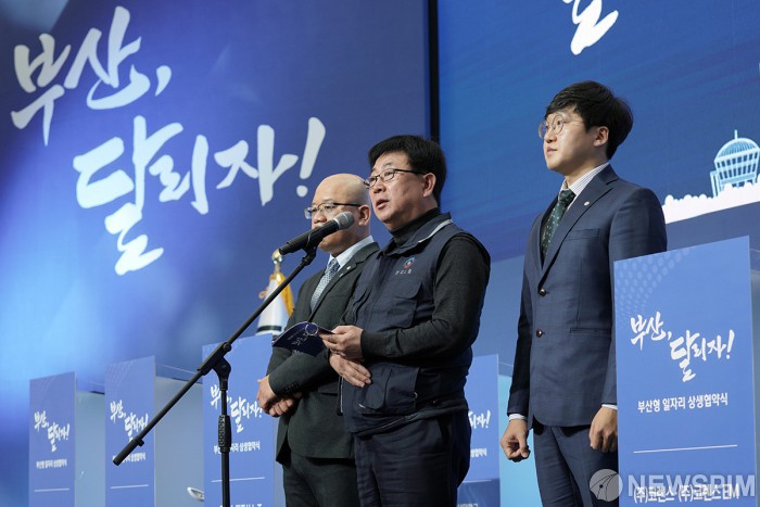 [서울=뉴스핌]=서영기 한국노총 부산지역본부 의장이 6일 부산시청에서 열린 '부산형 일자리 상생 협약식' 에서 소감을 말하고 있다. [사진=청와대 ] 2020.02.06.photo@newspim.com