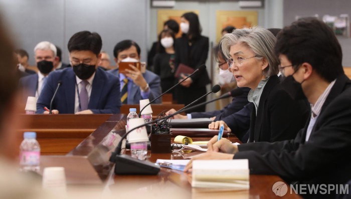 [서울=뉴스핌] 이한결 기자 = 강경화 외교부 장관이 6일 오후 서울 종로구 정부서울청사 별관 외교부에서 열린 코로나19 관련 주한외교단 대상 브리핑에서 모두 발언을 하고 있다. 2020.03.06 alwaysame@newspim.com