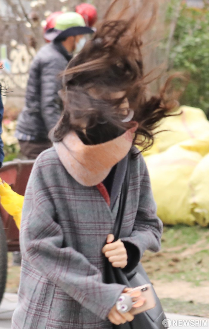 [서울=뉴스핌] 백인혁 기자 = 전국에 강풍주의보가 발령된 19일 오전 서울 종로구 광화문 네거리 인근에서 시민들이 출근길 발걸음을 서두르고 있다. 2020.03.19 dlsgur9757@newspim.com