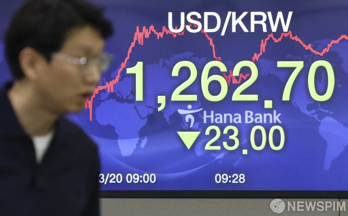 [서울=뉴스핌] 이한결 기자 = 한미 통화스와프가 체결된 20일 오전 달러/원 환율이 전 거래일 대비 32.0원 내린 1253.7원에 출발했다. 코스피 지수는 전 거래일 대비 40.85포인트(2.80%) 오른 1,498.49에 개장했고 코스닥은 15.53포인트(3.63%) 오른 443.88에 시작했다. 이날 오전 서울 중구 하나은행 딜링룸에서 딜러들이 업무를 보고 있다. 2020.03.20 alwaysame@newspim.com