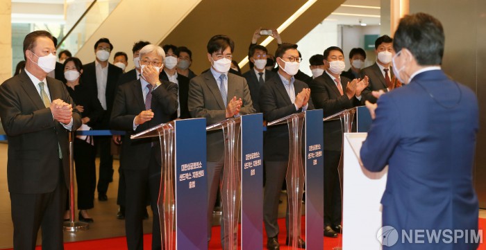 [서울=뉴스핌] 이한결 기자 = 정세균 국무총리와 박용만 대한상의 회장을 비롯한 참석자들이 12일 오후 서울 중구 대한상공회의소에서 열린 규제샌드박스 지원센터 출범식 행사에서 홍보영상을 시청한 뒤 박수치고 있다. 왼쪽부터 박용만 대한상의 회장, 이인용 삼성전자 사장, 공영운 현대차 사장, 김기웅 위쿡 대표, 이석우 두나무 대표, 변창환 콰라 대표, 정세균 국무총리. 2020.05.12 alwaysame@newspim.com