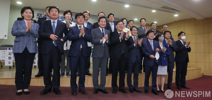 [서울=뉴스핌] 최상수 기자 = 김태년 더불어민주당 원내대표, 이낙연 더불어민주당 코로나19국난극복위원회 위원장을 비롯한 참석자들이 13일 오전 서울 여의도 국회의원회관에서 열린 '포스트코로나 언택트산업 전략 지원' 토론회에서 기념촬영을 하고 있다. 2020.05.13 kilroy023@newspim.com