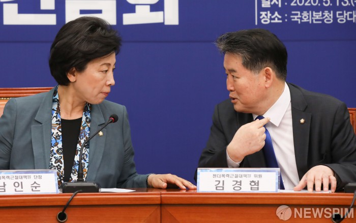 [서울=뉴스핌] 최상수 기자 = 13일 오전 서울 여의도 국회에서 열린 더불어민주당 젠더폭력근절대책TF 2차회의 겸 전문가간담회에서 남인순 단장, 김경협 위원이 대화를 나누고 있다. 2020.05.13 kilroy023@newspim.com