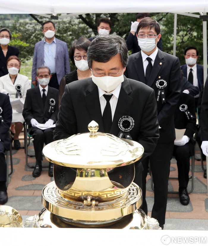 [서울=뉴스핌] 정일구 기자 = 10일 오전 서울 동작구 국립서울현충원에서 열린 고(故) 이희호 여사 1주기 추도식에서 김홍업 김대중평화센터 이사장이 분향하고 있다. 2020.06.10 mironj19@newspim.com