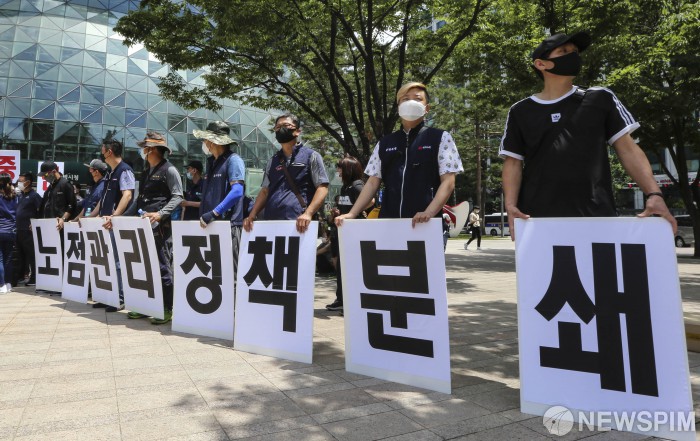 [서울=뉴스핌] 이한결 기자 = 11일 오후 서울 중구 서울특별시청 앞에서 민주노점상전국연합과 전국노점상총연합에 의해 열린 ‘6.13 정신계승 노점상 투쟁결의 공동기자회견’에서 참가자들이 손 팻말을 들고 있다. 2020.06.11 alwaysame@newspim.com
