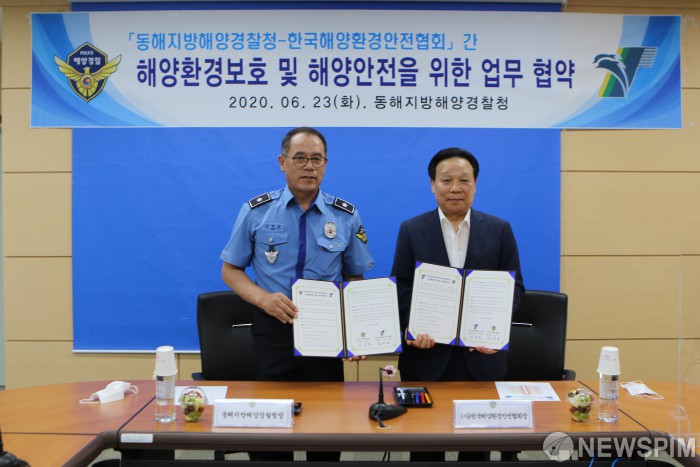 [동해=뉴스핌] 이형섭 기자 = 동해지방해양경찰청과 (사)한국해양환경안전협회는 지난 23일 해양환경 보호 및 해양안전을 위한 민‧관 협력체계 구축 업무협약을 체결했다. 협약에 따라 양 기관은 해양오염 방제 및 예방활동 지원, 해양사고시 인력·장비 지원, 해양환경 정보 교류를 위한 학술세미나 및 자문 등을 협력하기로 했다. [사진=동해해경청]2020.06.24 onemoregive@newspim.com