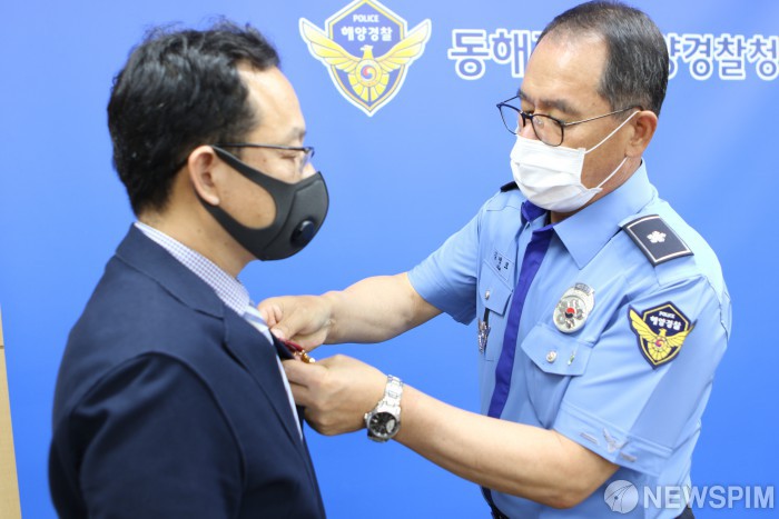 [동해=뉴스핌] 이형섭 기자 = 김영모 동해지방해양경찰청 청장은 30일 모범공무원으로 선정된 해양오염방제과 이기봉 주사에게 국무총리 표창과 업무유공자 10명에게 동해해경청장 표창을 수여했다.[사진=동해지방해양경찰청]2020.06.30 onemoregive@newspim.com