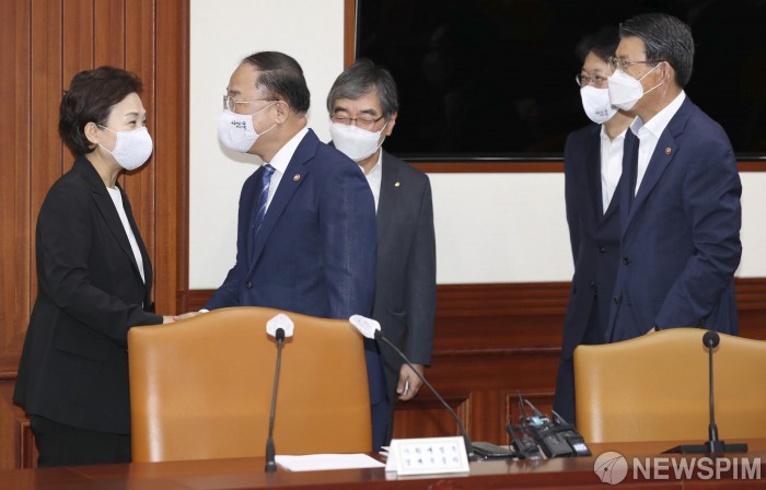 [서울=뉴스핌] 이한결 기자 = 홍남기 부총리 겸 기획재정부 장관과 김현미 국토교통부 장관(왼쪽)이 12일 오전 서울 종로구 정부서울청사에서 열린 제2차 부동산시장 점검 관계장관회의에서 대화를 나누고 있다. 2020.08.12 alwaysame@newspim.com