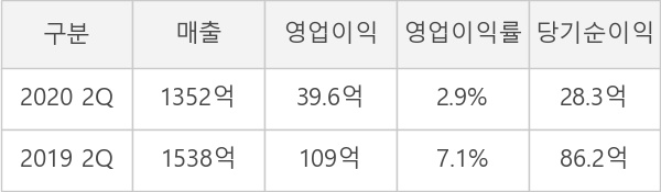 ◆ 2Q 실적, 영업이익 39.6억원 전년동기 대비 64% 감소... 매출액 12% 감소
