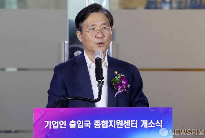 [서울=뉴스핌] 정일구 기자 = 성윤모 산업통상자원부 장관이 13일 오후 서울 강남구 코엑스에서 열린 기업인 출입국 종합지원센터 개소식에서 인사말을 하고 있다. 2020.08.13 mironj19@newspim.com