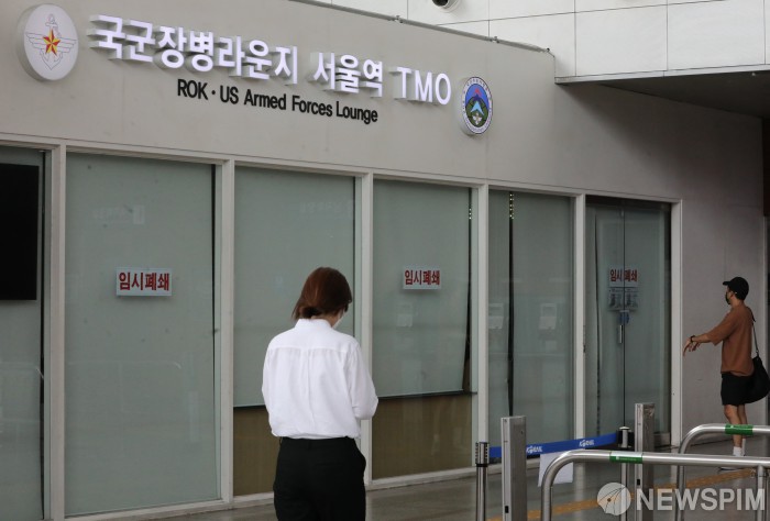 [서울=뉴스핌] 백인혁 기자 = 31일 오후 서울 용산구 서울역 내 위치한 국군장병라운지(TMO)가 임시폐쇄돼 있다. 국방부는 지난 30일 경기도 성남 공군부대와 대구 육군부대 등 3곳에서 5명의 감염자가 추가로 확인됐다고 밝혔다. 부대 내 감염이 이어지면서 국방부는 당초 오늘까지 시행하기로 했던 휴가 통제 조치를 일주일 더 연장하기로 했다. 이에 따라 이달 19일부터 31일까지 통제할 예정이었던 장병 휴가를 오는 9월 6일까지 통제한다. 2020.08.31 dlsgur9757@newspim.com