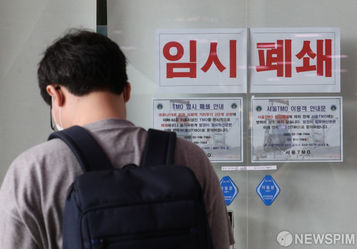 [서울=뉴스핌] 백인혁 기자 = 31일 오후 서울 용산구 서울역 내 위치한 국군장병라운지(TMO) 입구에 임시폐쇄 안내문이 붙어 있다. 국방부는 지난 30일 경기도 성남 공군부대와 대구 육군부대 등 3곳에서 5명의 감염자가 추가로 확인됐다고 밝혔다. 부대 내 감염이 이어지면서 국방부는 당초 오늘까지 시행하기로 했던 휴가 통제 조치를 일주일 더 연장하기로 했다. 이에 따라 이달 19일부터 31일까지 통제할 예정이었던 장병 휴가를 오는 9월 6일까지 통제한다. 2020.08.31 dlsgur9757@newspim.com