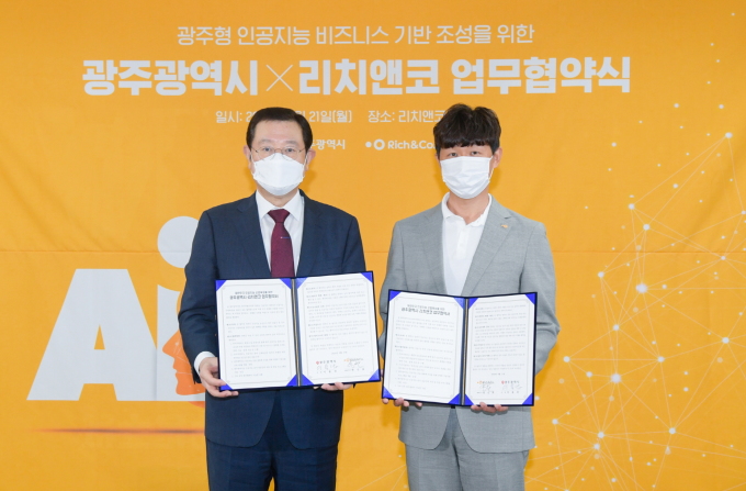 [광주=뉴스핌] 조은정 기자 = 광주시와 ㈜리치앤코는 21일 오후 리치앤코 서울 본사에서 광주형 인공지능 비즈니스 기반 조성을 위한 36번째 업무협약을 체결했다고 밝혔다.