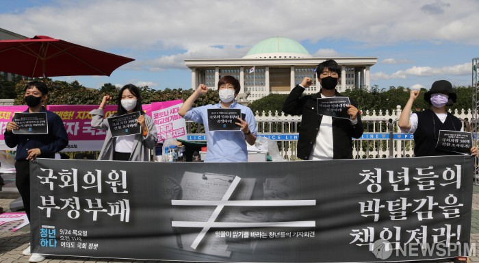[서울=뉴스핌] 백인혁 기자 = 2030정치공동체 청년하다 관계자들이 24일 오전 서울 여의도 국회 앞에서 윗물이 맑기를 바라는 청년들의 기자회견을 하고 있다. 2020.09.24 dlsgur9757@newspim.com