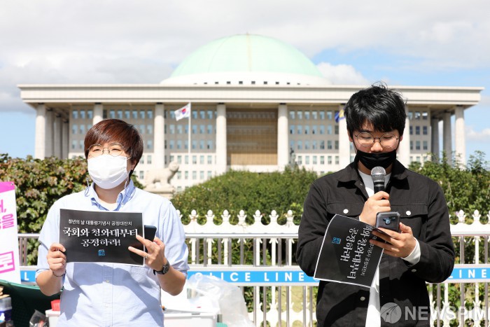 [서울=뉴스핌] 백인혁 기자 = 2030정치공동체 청년하다 관계자들이 24일 오전 서울 여의도 국회 앞에서 윗물이 맑기를 바라는 청년들의 기자회견을 하고 있다. 2020.09.24 dlsgur9757@newspim.com