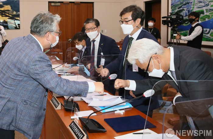 [서울=뉴스핌] 최상수 기자 = 조응천 더불어민주당 의원이 8일 오전 서울 여의도 국회에서 열린 국토교통위원회 한국토지주택공사 주택관리공사 등에 대한 국정감사 시작에 앞서 변창흠 한국토지주택공사(LH)사장 등 피감기관 관계자들과 인사하고 있다. 2020.10.08 kilroy023@newspim.com