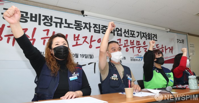 [서울=뉴스핌] 김학선 기자 = 민주노총공공운수노조가 19일 서울 중구 민주노총 대회의실에서 공공비정규노동자 집중파업 선포 기자회견을 열고 구호를 외치고 있다. 2020.10.19 yooksa@newspim.com