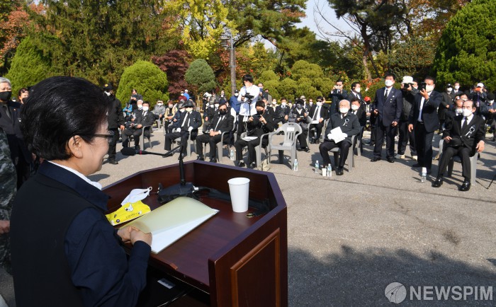 [서울=뉴스핌] 이형석 기자 = 박근령 전 육영재단 이사장이 26일 서울 동작구 국립서울현충원에서 열린 고(故) 박정희 전 대통령 서거 41주기 추도식에서 유족인사를 하고 있다. 2020.10.26 leehs@newspim.com