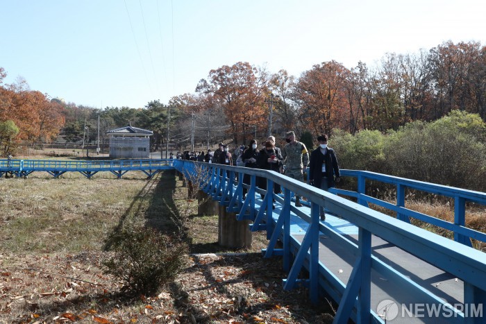 [판문점=뉴스핌] 사진공동취재단 = 판문점견학지원센터 개소식에 참가했던 시범견학단이 4일 오전 경기도 파주시 판문점 견학 코스에 포함된 도보다리를 둘러보고 있다. 2020.11.04 photo@newspim.com