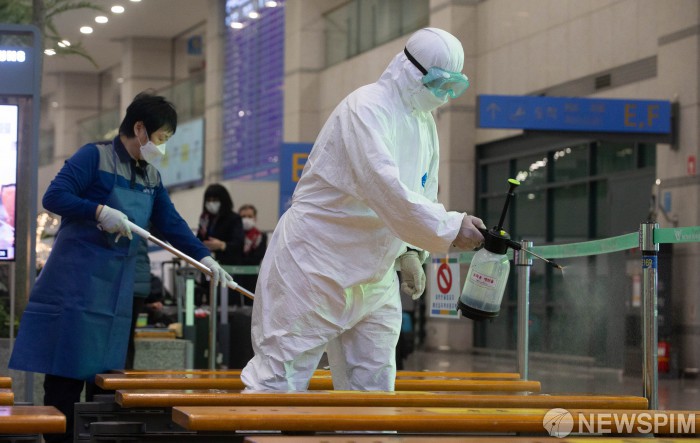 [영종도=뉴스핌] 윤창빈 기자 = 29일 오전 인천국제공항 제1터미널 입국장에서 관계자들이 방역을 하고 있다. 정부는 최근 영국에서 입국한 확진자에게서 영국 변이 바이러스가 확인된 데에 따른 조치로 내년 1월 7일까지 영국에서 들어오는 항공편에 대한 운항중단을 일주일 연장하기로 했다. 2020.12.29 pangbin@newspim.com