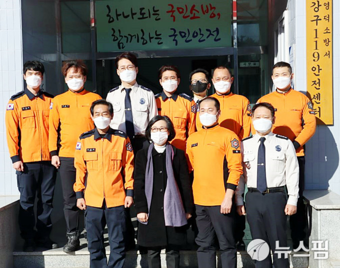 | 경북 영덕소방서를 방문한 김제남 청와대 시민사회수석이 소방대원들과 함께 기념촬영하고 있다.[사진=영덕소방서] 2020.12.31 nulcheon@newspim.com |