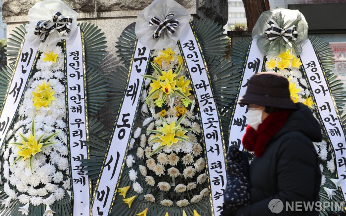 [서울=뉴스핌] 정일구 기자 = 6일 오전 서울 양천구 서울남부지방법원 정문 앞에 양부모의 학대로 사망한 정인 양을 추모하는 근조화환이 놓여 있다. 정인 양의 양부모에 대한 첫 재판은 오는 13일 서울남부지법에서 열릴 예정이다. 2021.01.06 mironj19@newspim.com