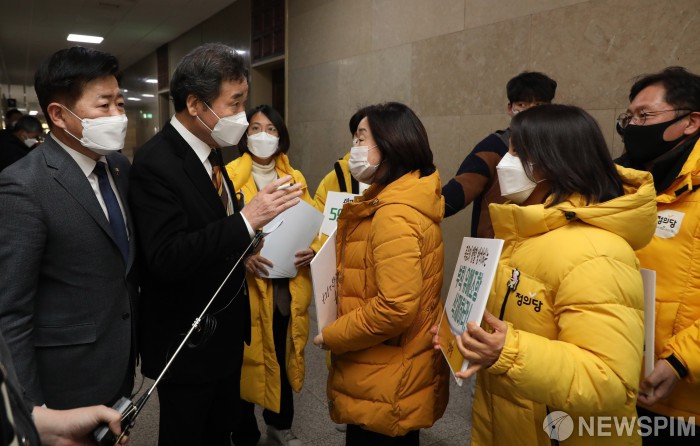 [서울=뉴스핌] 최상수 기자 = 더불어민주당 의원총회가 열리는 7일 오후 국회 회의실 앞에서 정의당 의원들이 온전한 중대재해기업처벌법 제정을 촉구하며 이낙연 대표에게 호소하고 있다. 2021.01.07 kilroy023@newspim.com