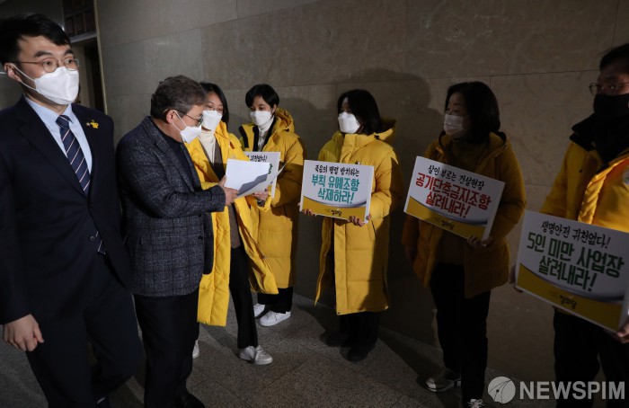 [서울=뉴스핌] 최상수 기자 = 더불어민주당 의원총회가 열리는 7일 오후 국회 회의실 앞에서 정의당 의원들이 온전한 중대재해기업처벌법 제정을 촉구하며 민주당 의원들에게 호소하고 있다. 2021.01.07 kilroy023@newspim.com
