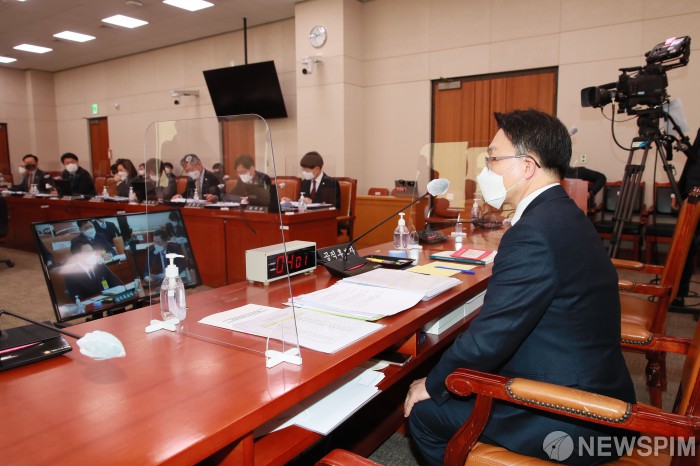 [서울=뉴스핌] 최상수 기자 = 김진욱 초대 고위공직자범죄수사처(공수처) 처장 후보자가 19일 오전 서울 여의도 국회 법제사법위원회에서 열린 인사청문회에 출석해 의원들의 질의에 답변하고 있다. 2021.01.19 kilroy023@newspim.com
