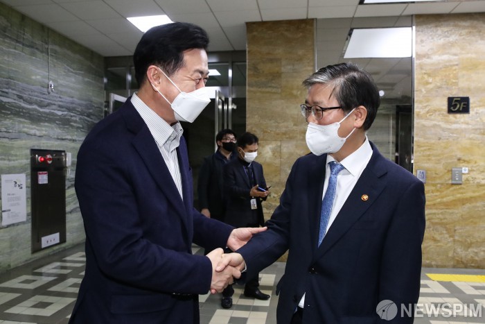 [서울=뉴스핌] 최상수 기자 = 김영춘 더불어민주당 부산시장 예비후보(왼쪽)가 3일 오후 국회 국토교통위원회 위원장실 앞에서 변창흠 국토교통부 장관(오른쪽)을 만나 인사히고 있다. 2021.02.03 kilroy023@newspim.com
