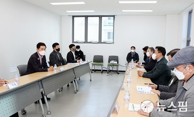 5일 포항지진피해조사단 회의실에서 열린 간담회에는 이 시장을 비롯, 지진피해조사단 주관사 A1손해사정 대표 등 10명이 참석했다.