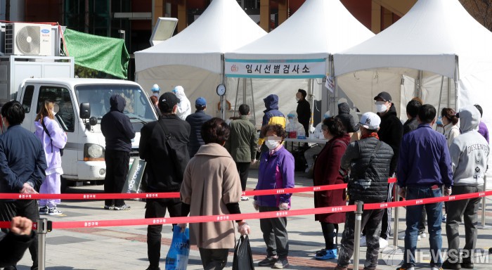 [서울=뉴스핌] 정일구 기자 = 22일 오후 서울 구로구 구로역 광장에 마련된 외국인 밀집지역 신종 코로나바이러스 감염증(코로나19) 임시 선별검사소에서 시민들이 검사를 받기 위해 줄지어 서있다. 2021.03.22 mironj19@newspim.com