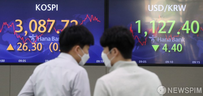 [서울=뉴스핌] 정일구 기자 = 1일 코스피 지수가 전 거래일(3061.42)보다 12.35포인트(0.40%) 오른 3073.77에 출발했다. 코스닥 지수는 전 거래일(956.17)보다 0.70포인트(0.07%) 상승한 956.87에 개장했다. 원·달러 환율은 전 거래일(1131.8원)보다 3.8원 내린 1128.0원에 출발했다. 이날 오전 서울 중구 하나은행 딜링룸에서 딜러들이 업무를 보고 있다. 2021.04.01 mironj19@newspim.com