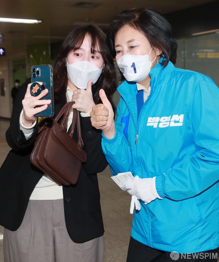 [서울=뉴스핌] 국회사진취재단 = 박영선 더불어민주당 서울시장 후보가 1일 오전 서울 마포구 합정역에서 한 시민과 셀카를 촬영하고 있다. 2021.04.01 photo@newspim.com