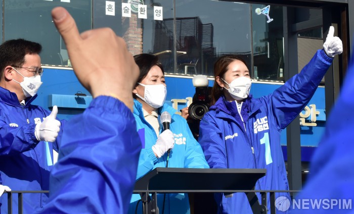 [서울=뉴스핌] 국회사진취재단 = 4.7 재보선이 이틀 앞으로 다가온 5일 박영선 더불어민주당 시장 후보가 서울 강서구 내발산동 발산역 사거리 일대에서 유세를 하고 있다. 2021.04.05 photo@newspim.com