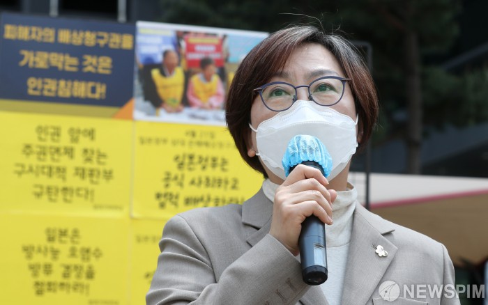 [서울=뉴스핌] 정일구 기자 = 이나영 정의기억연대 이사장이 21일 오후 서울 종로구 옛 일본대사관 앞에서 열린 제1488차 일본군성노예제 문제해결을 위한 정기 수요시위 기자회견에서 발언을 하고 있다. 2021.04.21 mironj19@newspim.com