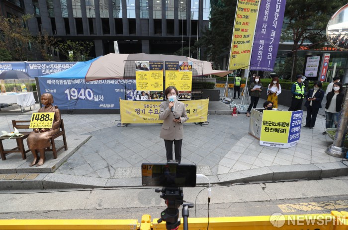 [서울=뉴스핌] 정일구 기자 = 이나영 정의기억연대 이사장이 21일 오후 서울 종로구 옛 일본대사관 앞에서 열린 제1488차 일본군성노예제 문제해결을 위한 정기 수요시위 기자회견에서 발언을 하고 있다. 2021.04.21 mironj19@newspim.com