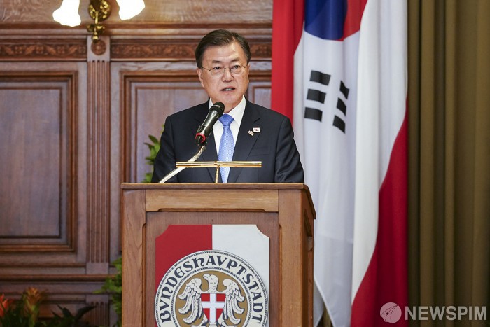 [서울=뉴스핌] 문재인 대통령이 14일(현지시간) 비엔나 시청을 방문,미카엘 루드비히 비엔나 시장 환영사에 대한 답사를 하고 있다. [사진=청와대] 2021.06.15photo@newspim.com