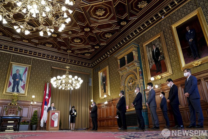 [서울=뉴스핌] 문재인 대통령이 14일(현지시간) 비엔나 시청을 방문,미카엘 루드비히 비엔나 시장 환영사에 대한 답사를 하고 있다. [사진=청와대] 2021.06.15photo@newspim.com