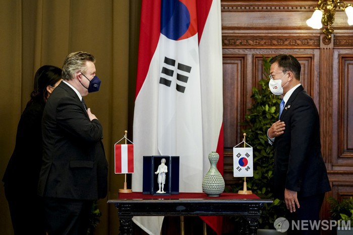 [서울=뉴스핌] 문재인 대통령이 14일(현지시간) 비엔나 시청을 방문, 미카엘 루드비히 비엔나 시장과 각각의 선물을 전달하고 있다. [사진=청와대] 2021.06.15photo@newspim.com