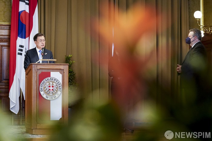 [서울=뉴스핌] 문재인 대통령이 14일(현지시간) 비엔나 시청을 방문,미카엘 루드비히 비엔나 시장 환영사에 대한 답사를 하고 있다. [사진=청와대] 2021.06.15photo@newspim.com