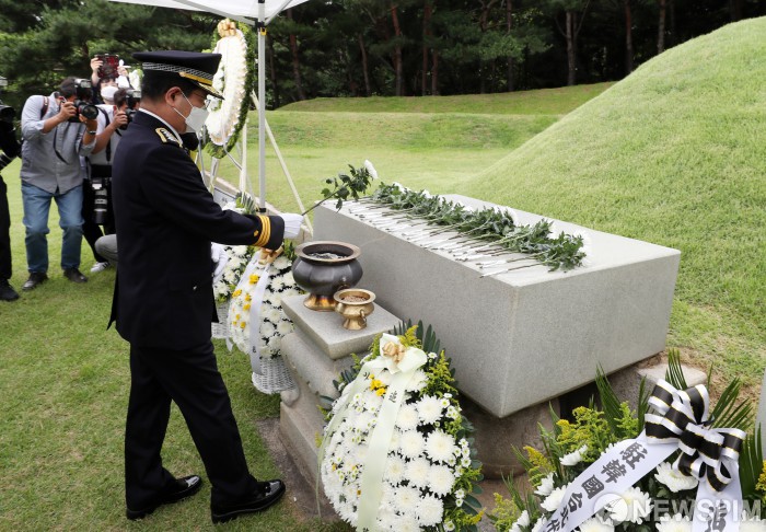 [서울=뉴스핌] 정일구 기자 = 김창룡 경찰청장이 백범 김구 선생 서거 제72주기인 26일 오전 서울 용산구 효창공원 백범 김구 선생 묘역을 찾아 참배하고 있다. 2021.06.26 mironj19@newspim.com