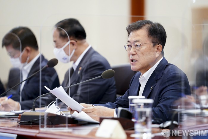 [서울=뉴스핌] 문재인 대통령이 28일 오후 청와대에서 열린 확대경제장관회의에서 발언을 하고 있다. [사진=청와대] 2021.06.28 photo@newspim.com