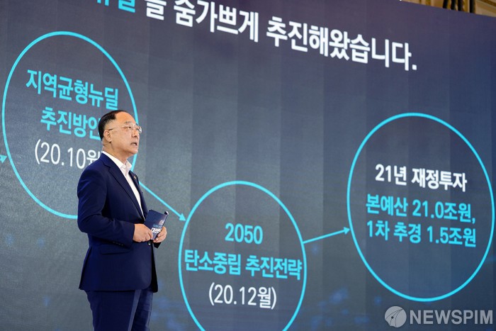 [서울=뉴스핌] 홍남기 부총리겸 기획재정부 장관이 14일 오전 청와대에서 열린 제4차 한국판 뉴딜 전략회의에서 한국판 뉴딜 2.0 세부정책방안 보고를 하고 있다. [사진=청와대] 2021.07.14 photo@newspim.com