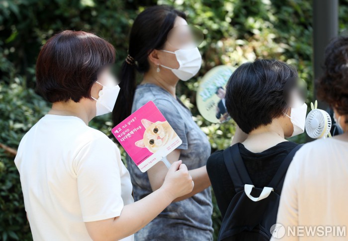 [서울=뉴스핌] 정일구 기자 = 연일 폭염이 이어지고 있는 23일 오후 서울 양천구 파리공원에 마련된 찾아가는 선별진료소에서 시민들이 부채와 손선풍기로 더위를 식히고 있다. 중앙방역대책본부는 이날 0시 기준으로 신규 확진자가 1630명 늘어 누적 18만5733명이라고 밝혔다. 2021.07.23 mironj19@newspim.com