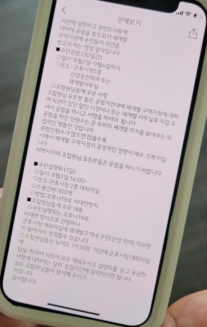 이어 "주민설명회는 2일 오후 2시부터 군포시청 2층 대회의실에서 100명 규모로 비대면 방식으로 진행한다"라며 "조합원들은 늦어도 1시30분 이전에 군포시청 대회의실에 입실해야 한다"며 "100석 모두 채워주시고 설명회를 듣고 궁금한 사항에 대하여는 질의 응답시간에 질의하시면 된다"고 통보를 했다.