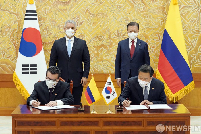 [서울=뉴스핌]황기철 국가보훈처장과 후안 카를로스 카이사 로세로 주한콜롬비아 대사가 25일 오전 청와대에서 열린 한-콜롬비아 협정·양해각서 서명식에서 양국 정상이 지켜보는 가운데 보훈 협력 MOU에 서명하고 있다. [사진=청와대] 2021.08.25
