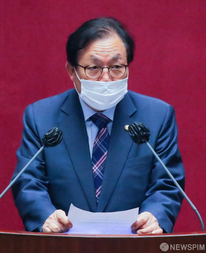 [서울=뉴스핌] 이형석 기자 = 31일 서울 여의도 국회에서 열린 본회의에서 신임 문화체육관광위원장으로 선출된 이채익 국민의힘 의원이 인사말을 하고 있다. 2021.08.31 leehs@newspim.com