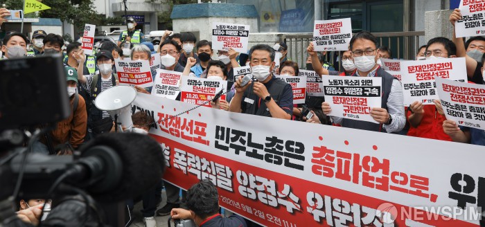 [서울=뉴스핌] 최상수 기자 = 전국민주노동조합총연맹이 2일 오전 서울 종로구 종로경찰서에서 양경수 위원장의 구속 결정에 대해 항의하는 집회를 열고 있다. 경찰은 이날 오전 5시 30분쯤 민주노총 사무실에서 양 위원장에 대한 구속영장을 집행했다. 2021.09.02 kilroy023@newspim.com