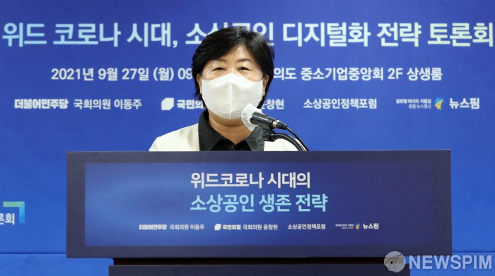 [서울=뉴스핌] 정일구 기자 = 서영교 국회 행정안전위원장이 27일 오전 서울 여의도 중소기업중앙회에서 이동주 더불어민주당 의원·윤창현 국민의힘 의원·뉴스핌 주최로 열린 '위드 코로나 시대, 소상공인 디지털화 전략 토론회'에서 축사를 하고 있다. 이번 토론회는 위드코로나 시대의 소상공인 생존 전략을 주제로 '제로페이 출범 2년의 성과와 한계'를 평가하고, 간편결제 산업의 미래를 조망해 보고자 마련됐다. 2021.09.27 mironj19@newspim.com
